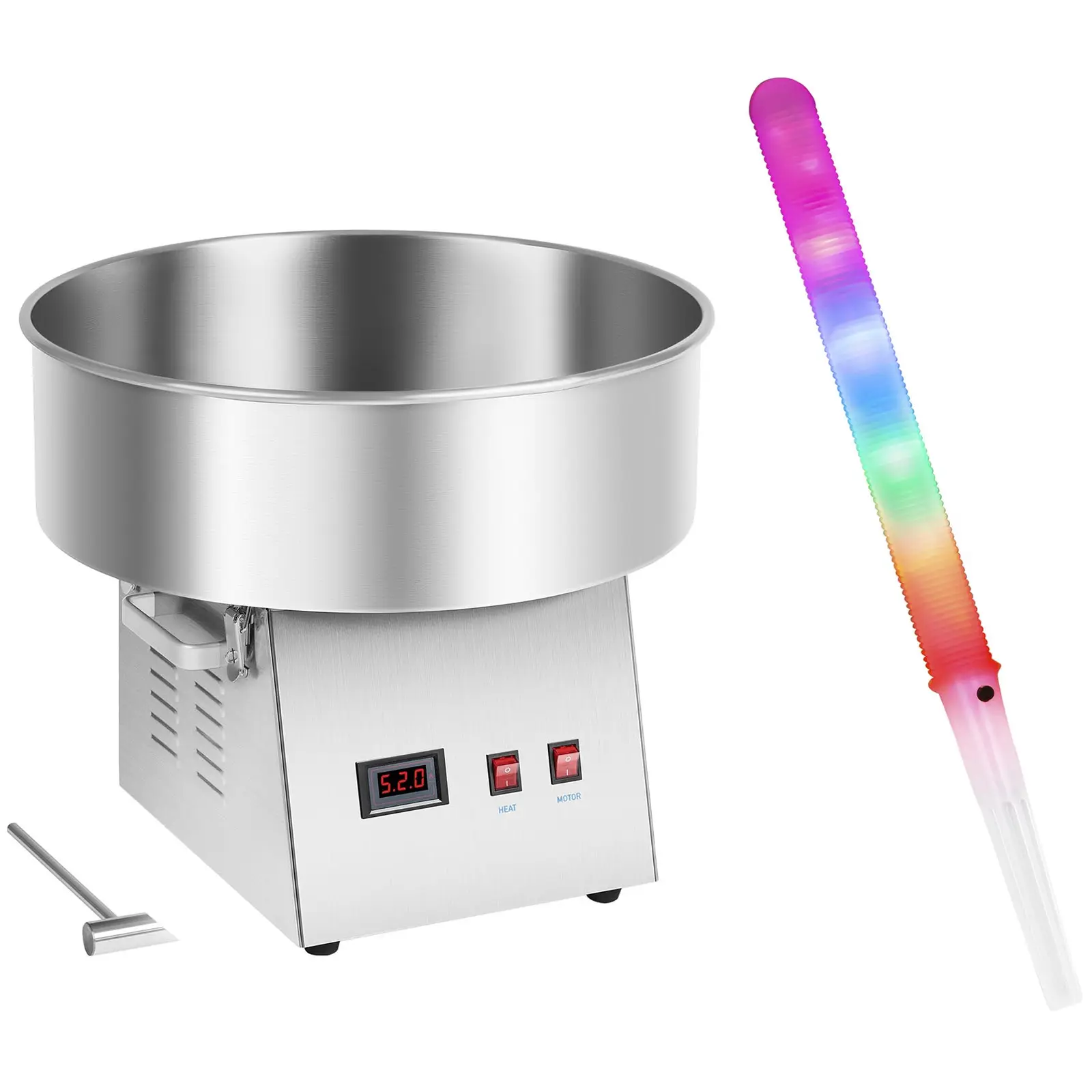 The cotton candy machine with LED cotton candy sticks RCZK-1030-W SET1 has everything you need for safely and spectacularly making and selling cotton candy. This high-performance stainless steel candy floss machine is designed for professional use. The perfect appliance for celebrations of all kinds. Our candy floss machine offers countless possibilities for variation so you can make your candy floss as unique and individual as the customers you serve. The set includes 50 LED cotton candy sticks with batteries, with seven colour modes and made of food-safe plastic.