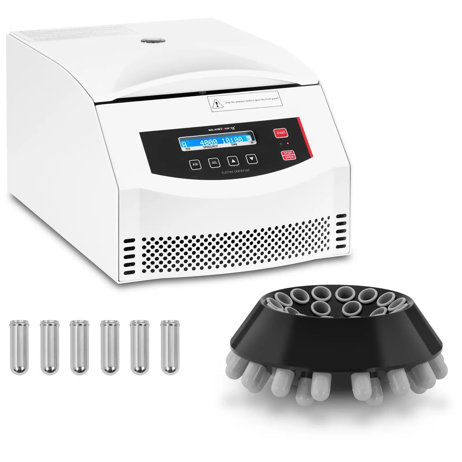 Use the electric drive with a power of 100 W to process six 50 ml tubes simultaneously with the built-in rotor. If you exchange the built-in angle rotor with the extra rotor, 24 tubes of 10 ml each are possible. If you want to use tubes with 5 ml instead of 10 ml, you will find eight corresponding adapters in the delivery. You can regulate the speed between 300 and 4000 rpm via a microprocessor and generate a maximum relative centrifugal acceleration of 2390 xg. With the laboratory centrifuge, you will always choose the best rotation speed for a specific sample: The adjustable speed allows you to generate the right centrifugal force and reliably separate solid particles from the liquid, which you then simply decant. Ten preset speeds make it easy for you to operate. The cover with alarm function protects your samples from contamination. Apart from the alarm, the electric centrifuge works silently and smoothly, so you can use the device in the laboratory without any disturbing noises.