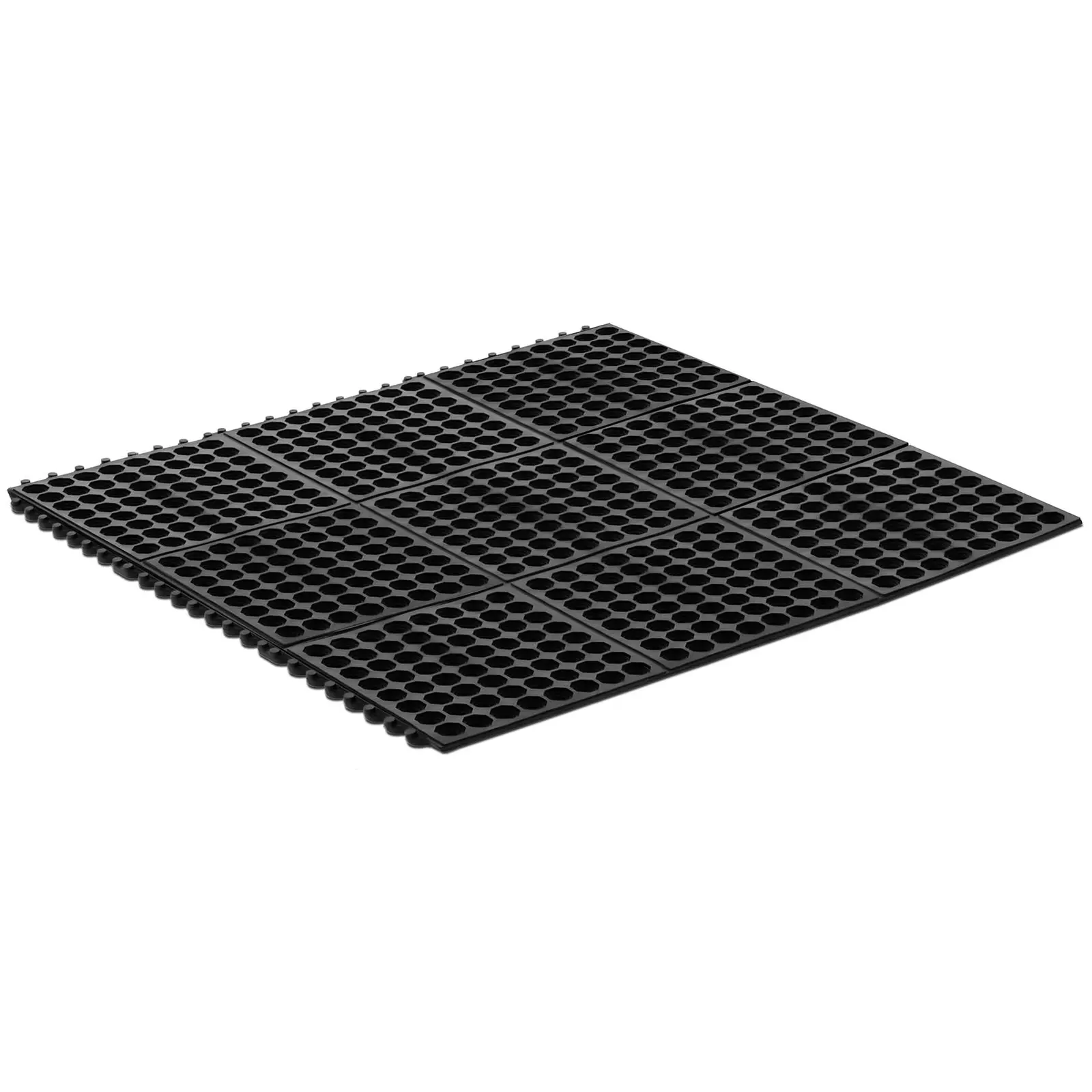 Measuring 92 x 92 cm, it offers sufficient surface area to absorb dirt and moisture in entrance areas or at a workplace. Multiple mats can be easily combined and laid out for a larger surface area. The special structure provides an excellent drainage effect and thus prevents slipping on damp or oily surfaces. At the same time, the 1 cm-thick mat absorbs shocks and can thus prevent damage to falling objects, and provides an anti-fatigue effect. Thanks to the heavy-duty quality, the mat lies securely and without slipping on a wide variety of surfaces without folded corners and does not become a tripping hazard itself.